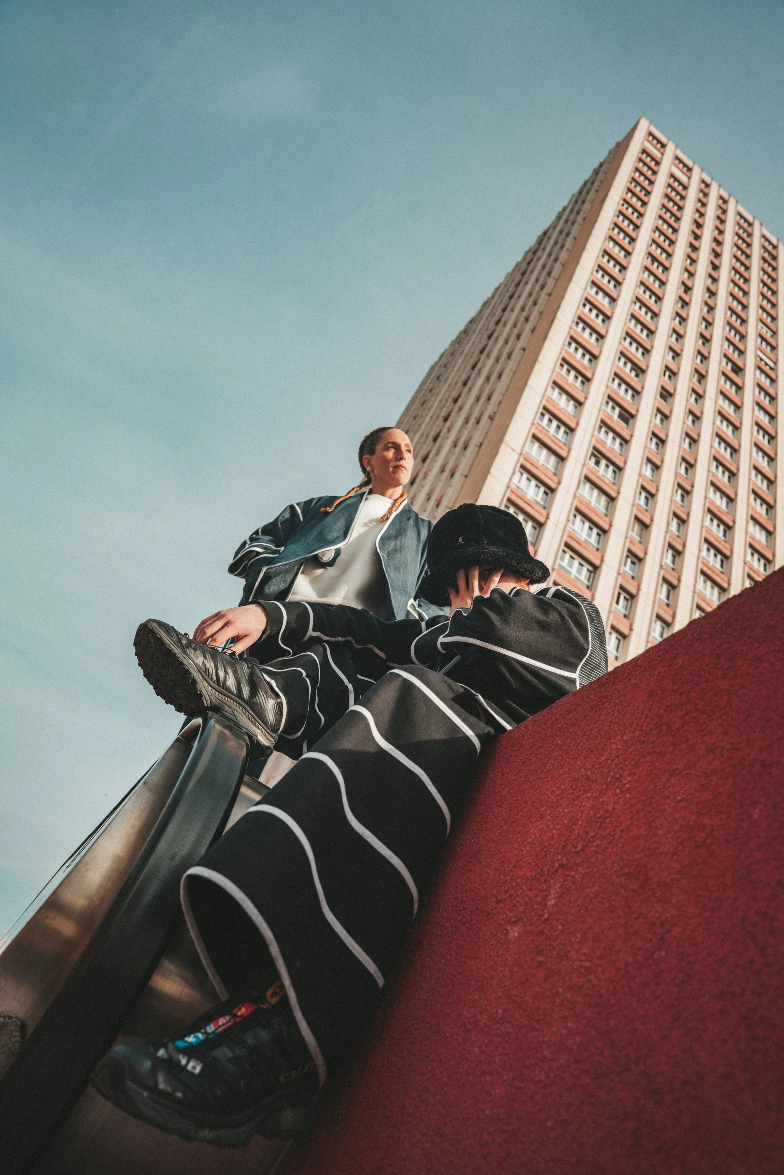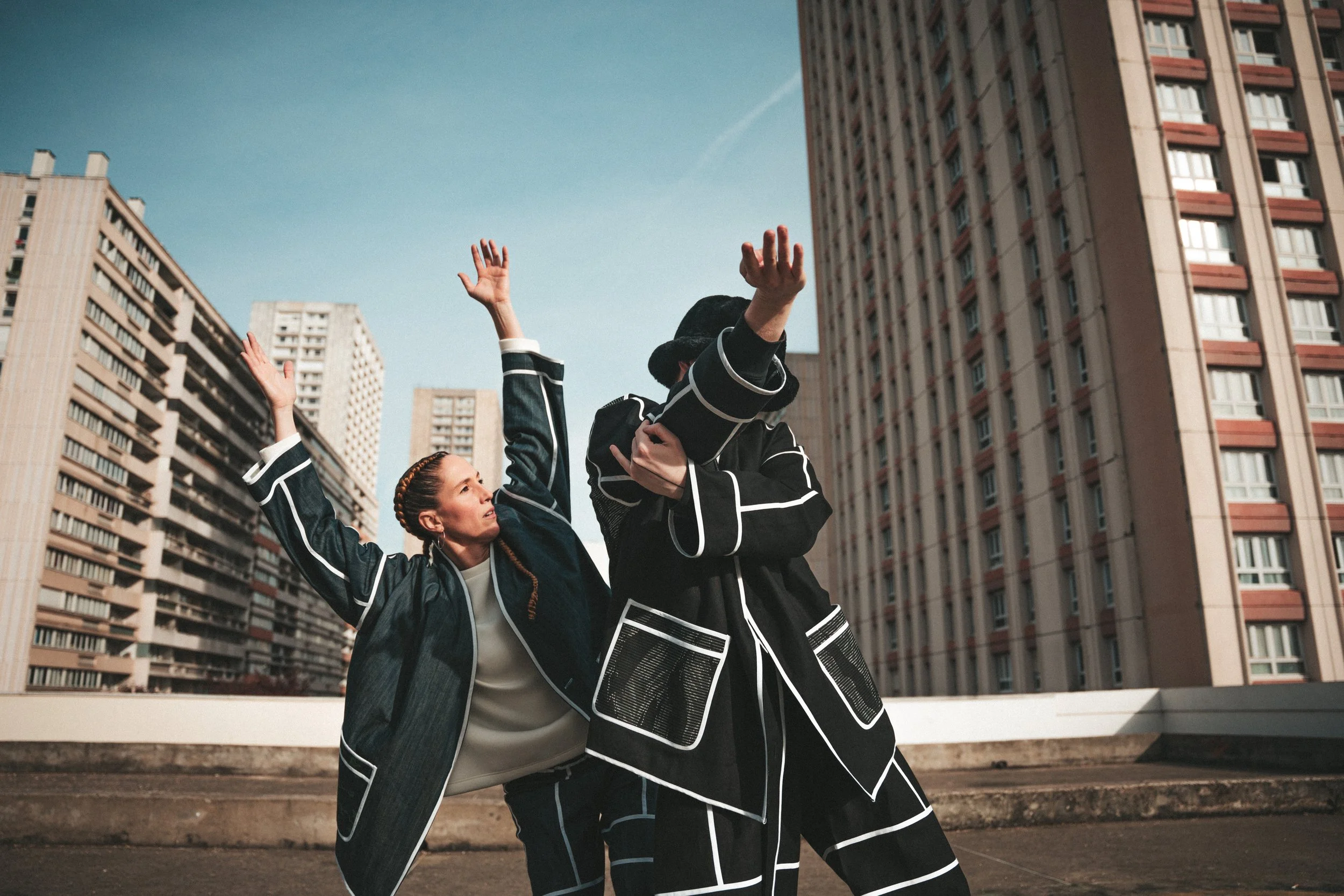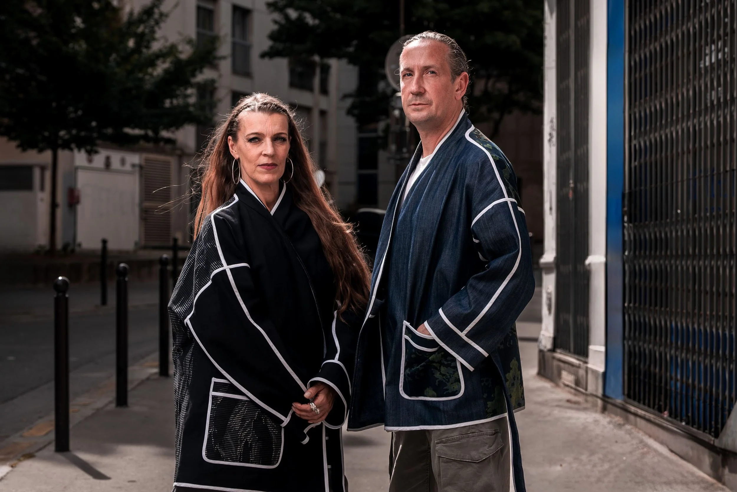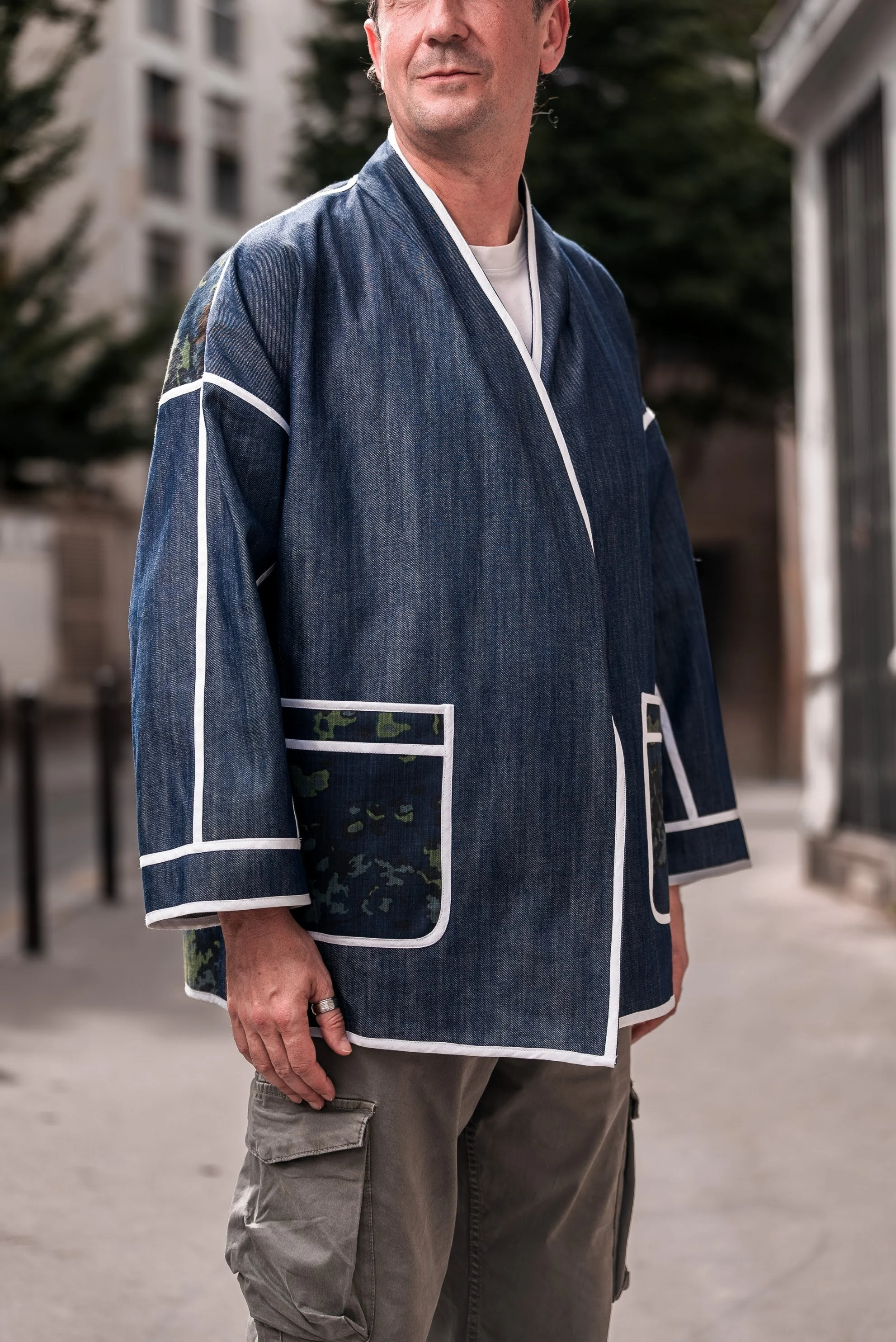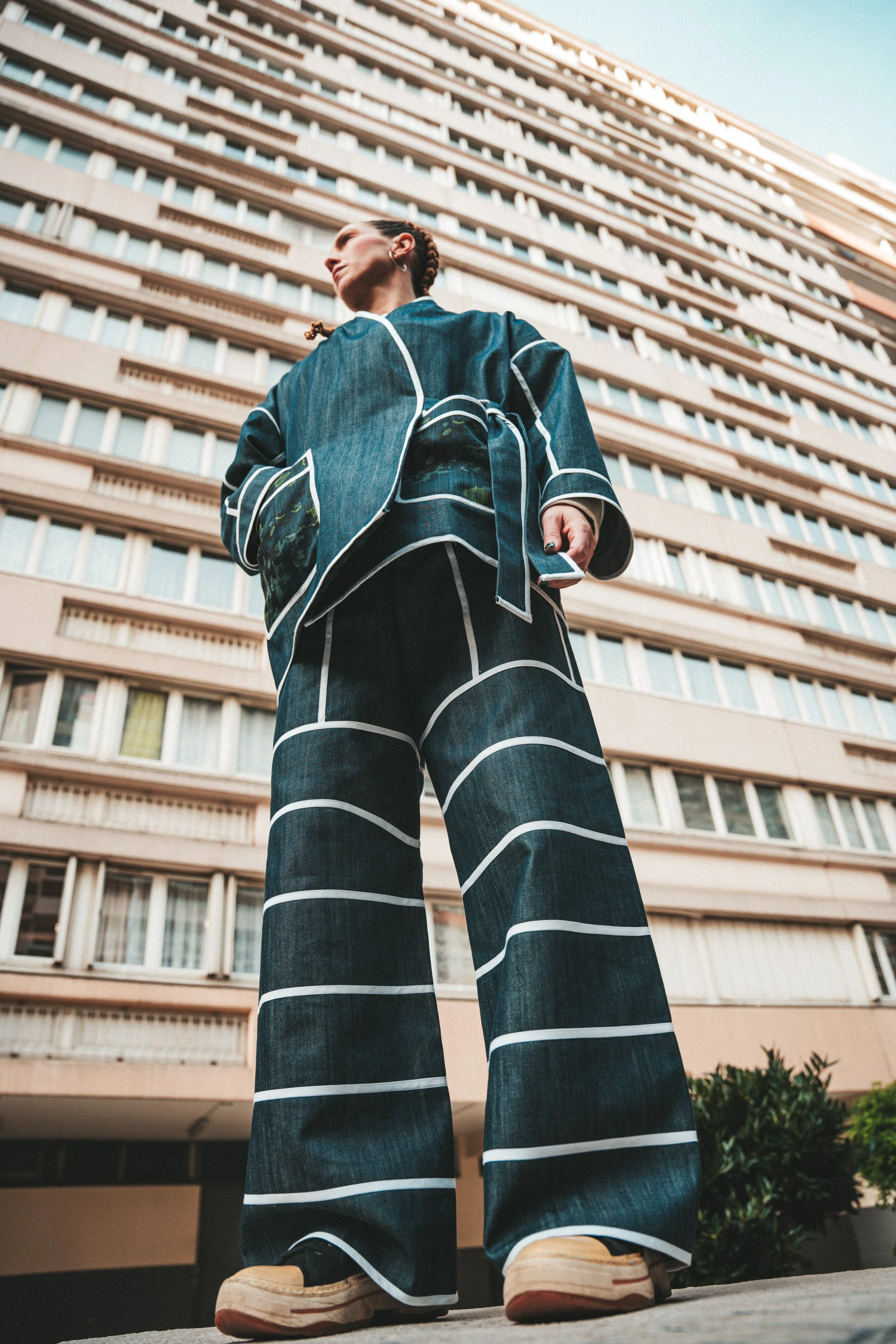 Un ensemble veste et pantalon en jeans recyclés avec des empiècements poches et dos contrastants. Une véritable création artisanale unique pour un look très puissant. Il est entièrement surpiqué de biais de coton bio blanc pour créer des lignes esthétiques très fortes.